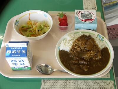 今日の給食は、開校150周年記念特別メニュー。所沢牛を使った若獅子カレー、お祝いミニケーキ、地域の野菜を使ったサラダ、そしてデザートのいちご等です。