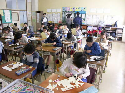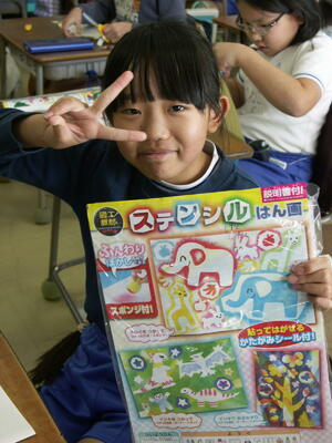 2年生が図工でステンシル版画を作成中です。ステンシル版画は画用紙を切り抜いて型紙を作り、それを孔版として使う版画です。デザインも大切ですが、切り抜いた孔版あくまでシルエットなので、あまり細かい絵柄にすると切り抜くのが難しくなりますし、何の形か分からなくなります。さらに、いかに上手にはさみを使って画用紙を切るかも大切な要素です。なかなか奥が深そうです。どんな作品に仕上がるか楽しみですね。