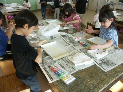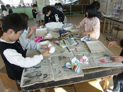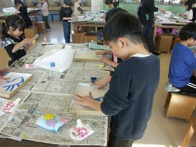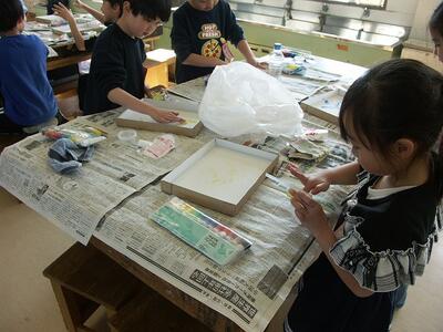 図工室で1年生が何だか楽しそうです。のぞいてみると液体粘土を使って嬉しそうに活動しています。クレヨンなどと組み合わせて自由な発想で絵を描きます。初めて触るどろっとした液体粘土にみんな大喜び。いろいろな材料が新しく登場して図工もバリエーションが豊富です。どんな仕上がりになるか楽しみです。